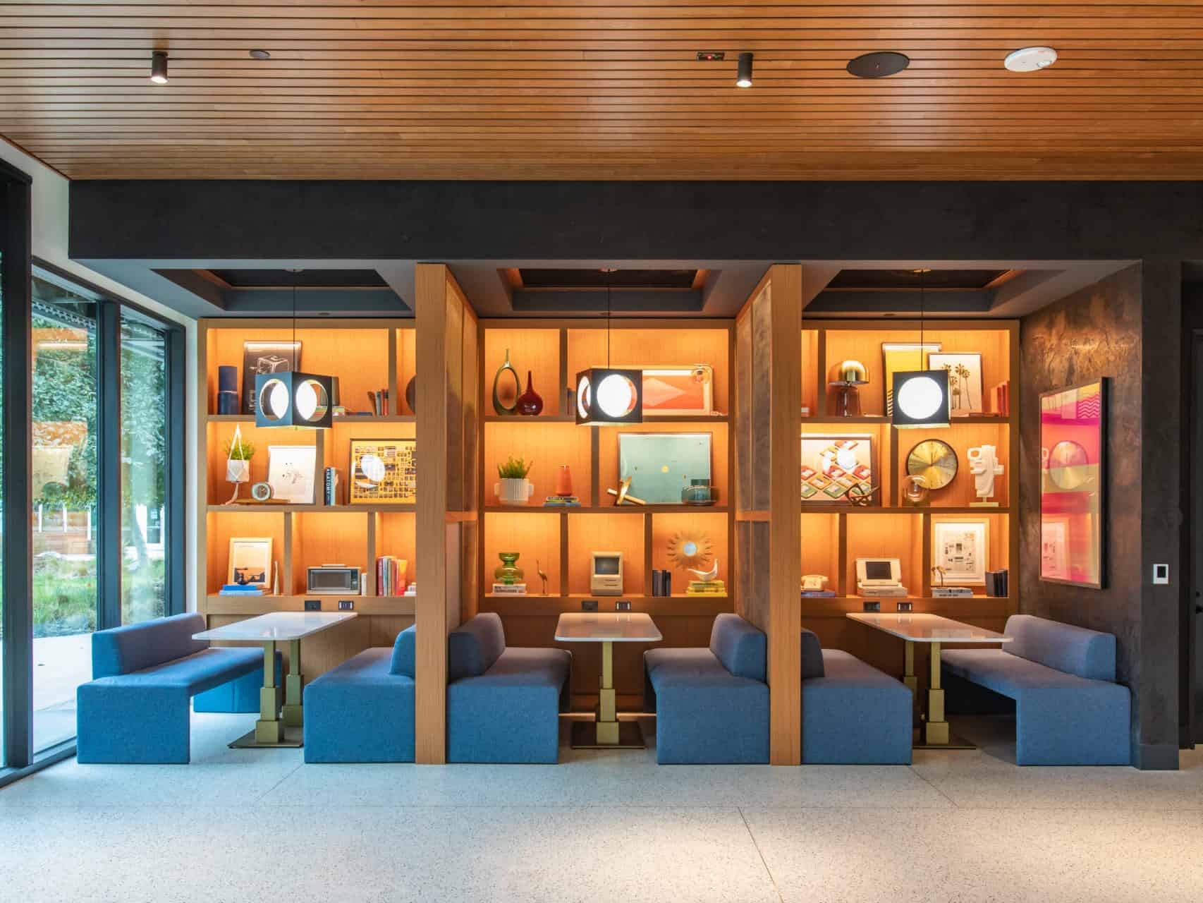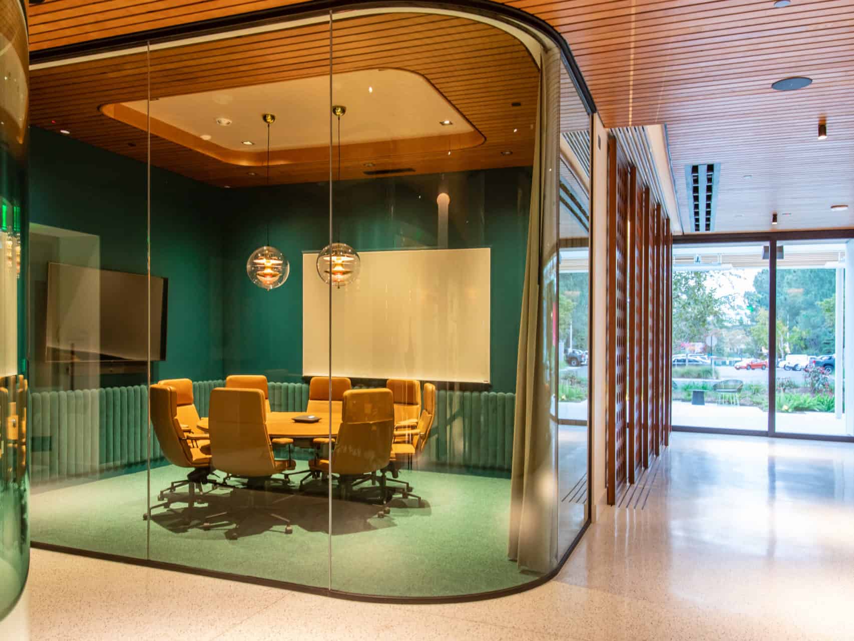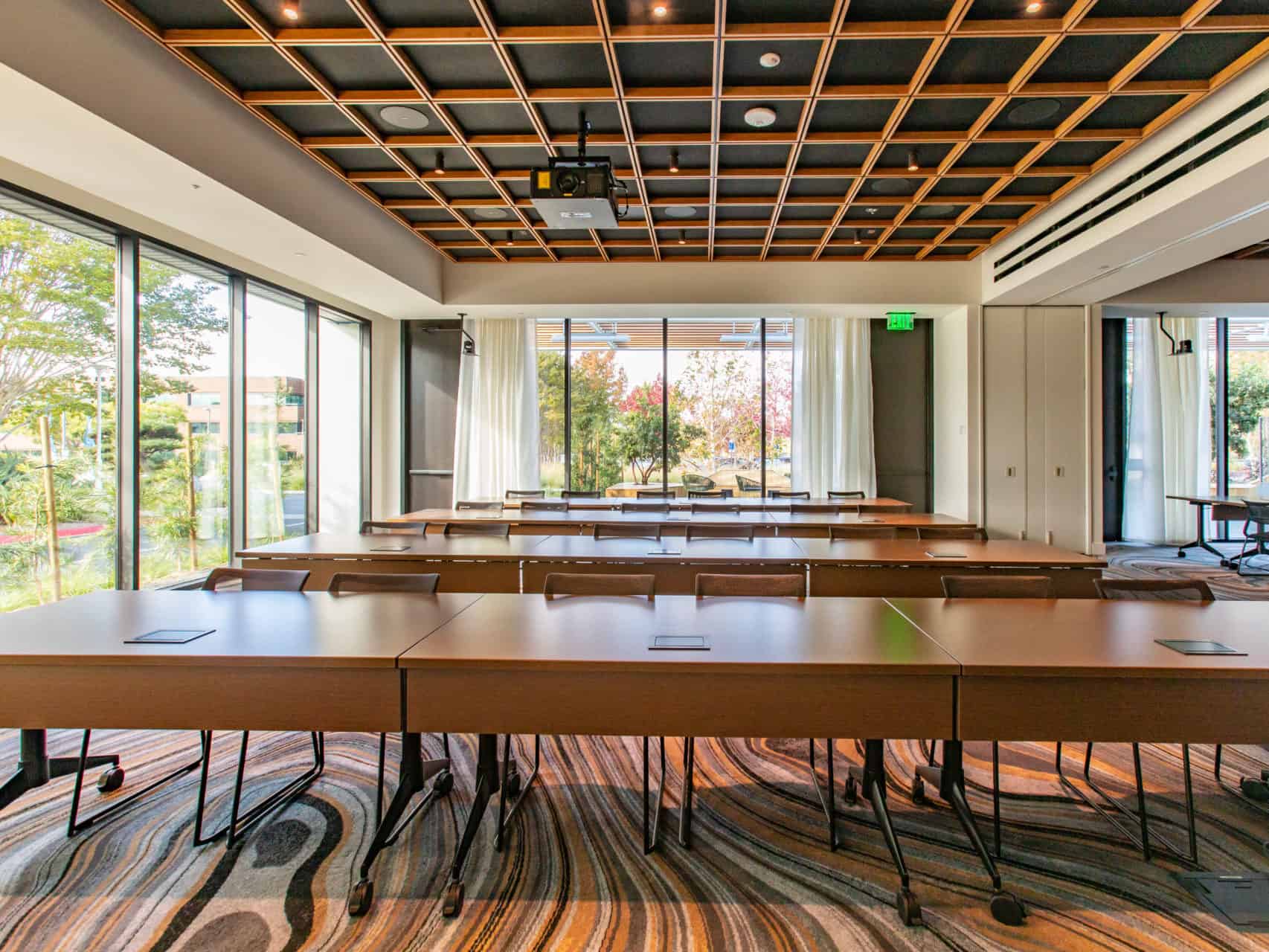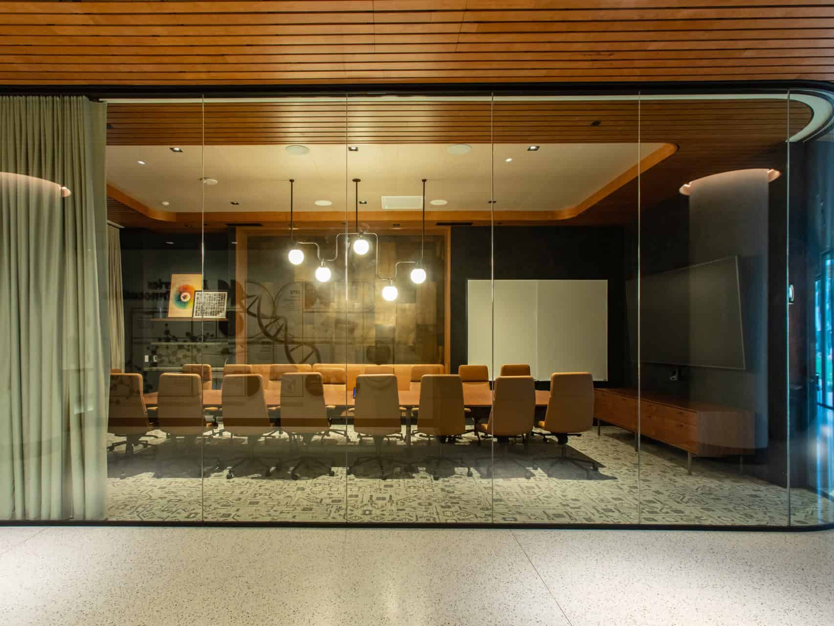 The space has two small conference rooms, an executive board room and training room with a lobby and lounge connected to the outside.