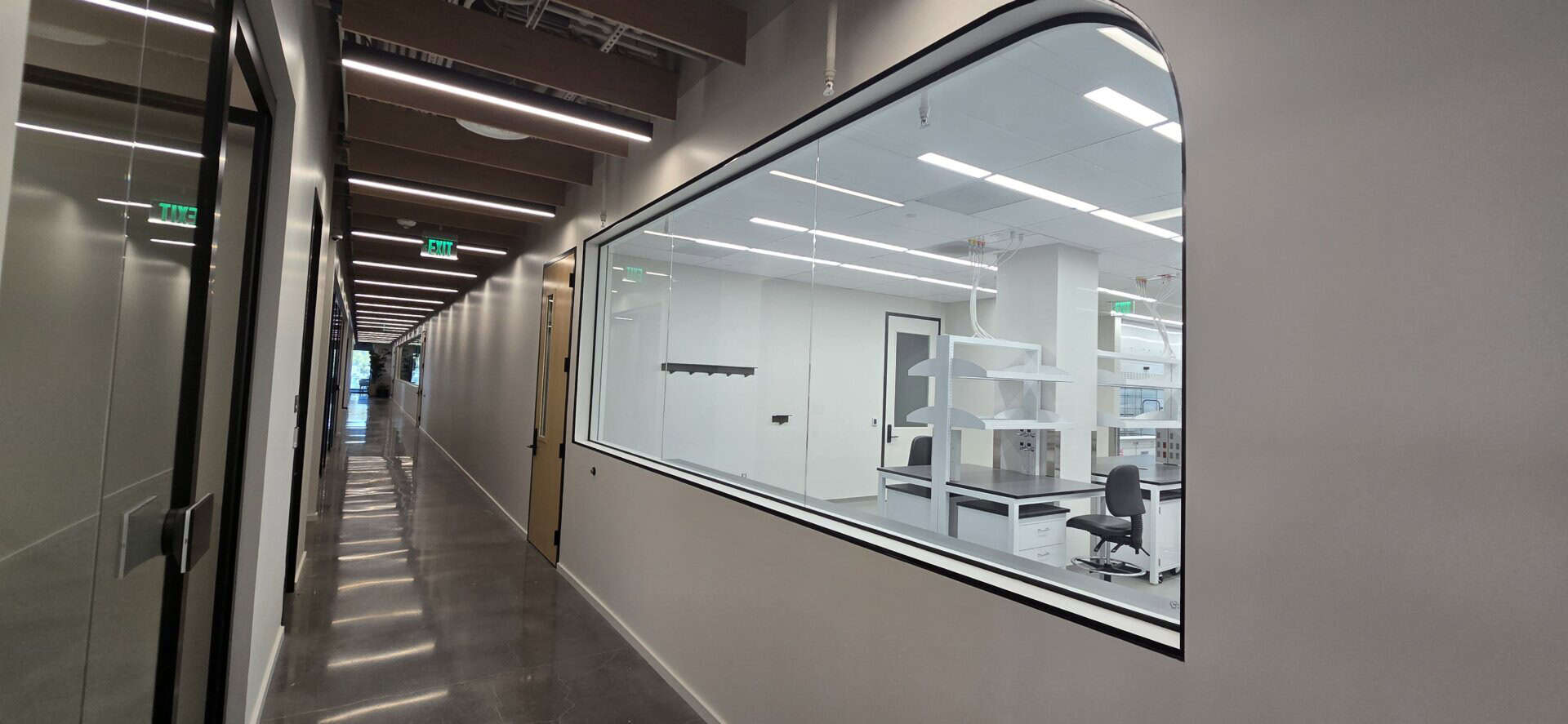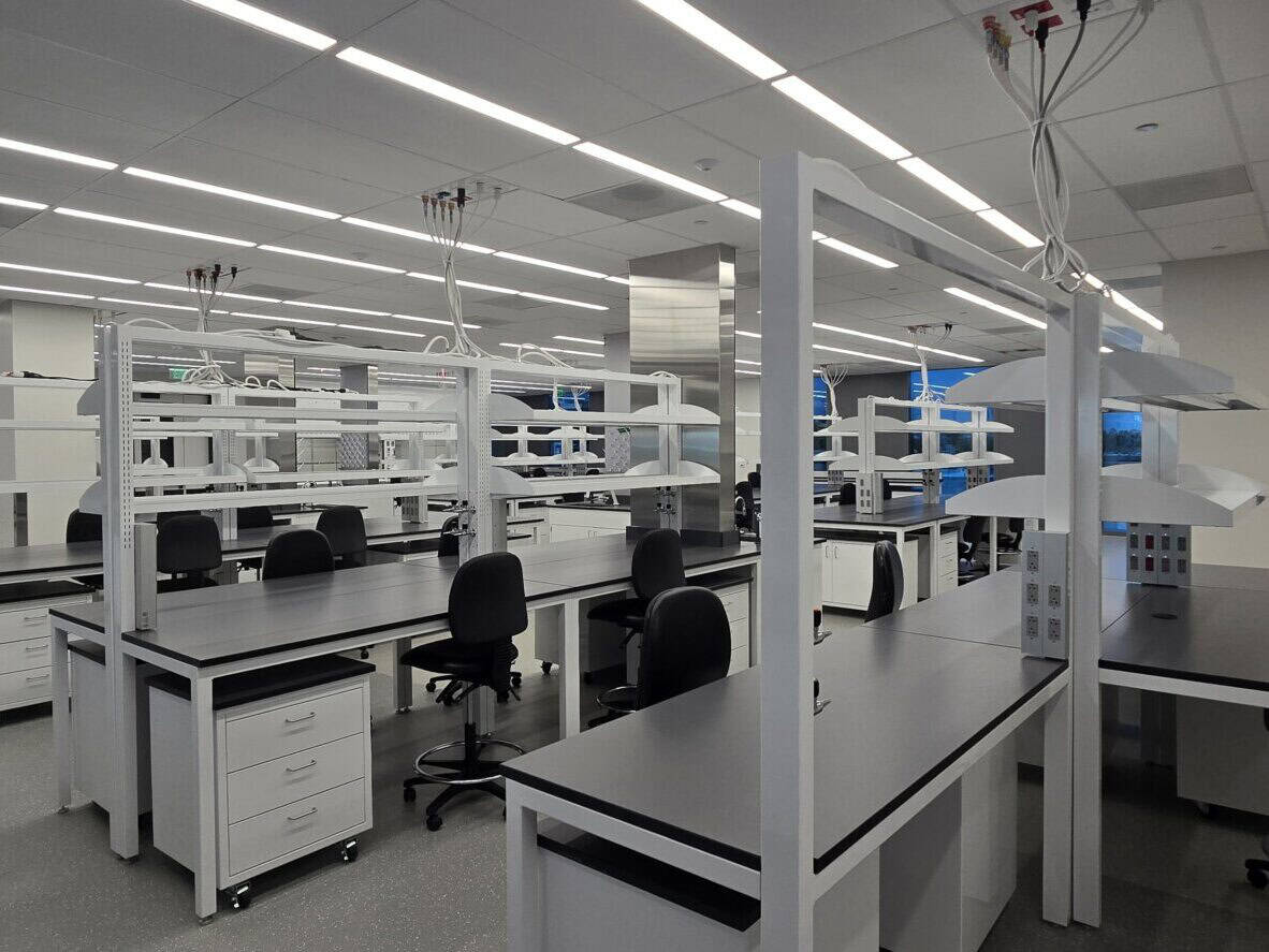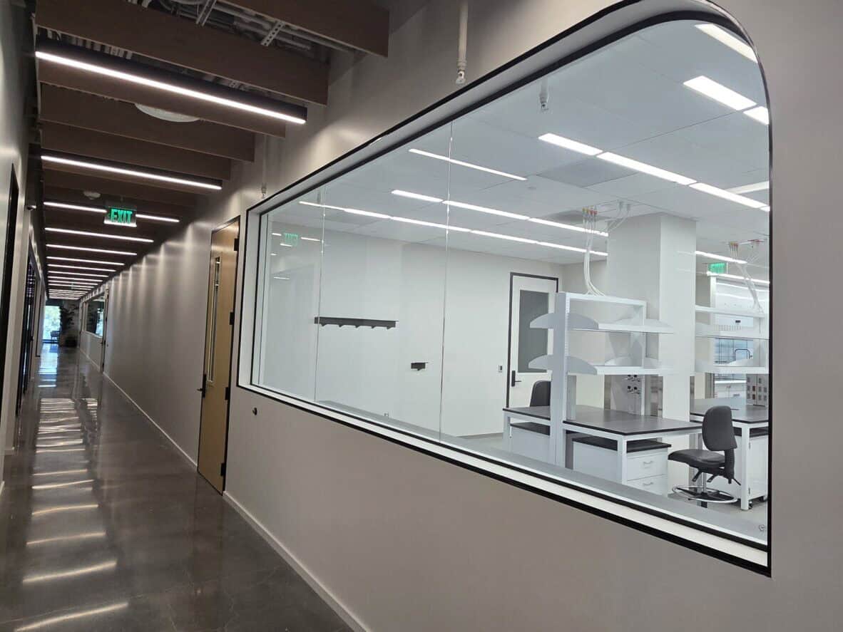 While the two suites are separated by a newly improved elevator lobby and restroom core, the spec suite is roughly 31,000 rentable square feet. It contains open lab space, lab support rooms, spacious tissue culture rooms, and a large cold room. The office area is similarly designed and separated from the labs with rated portal windows.