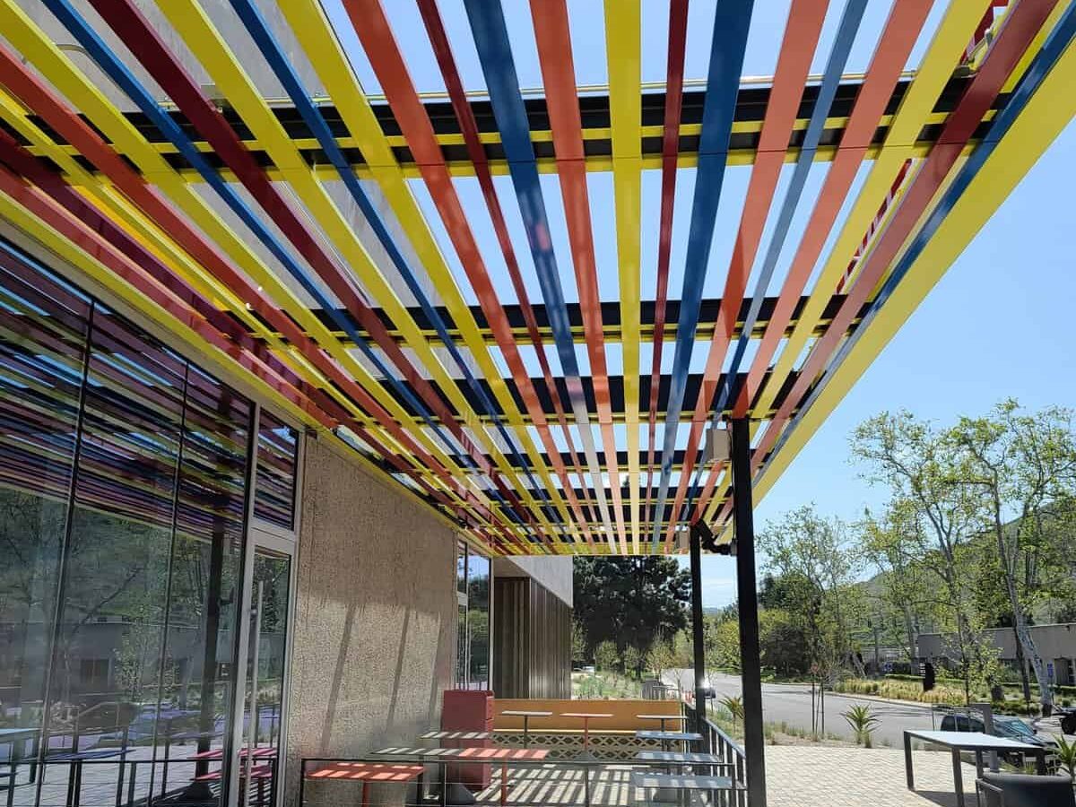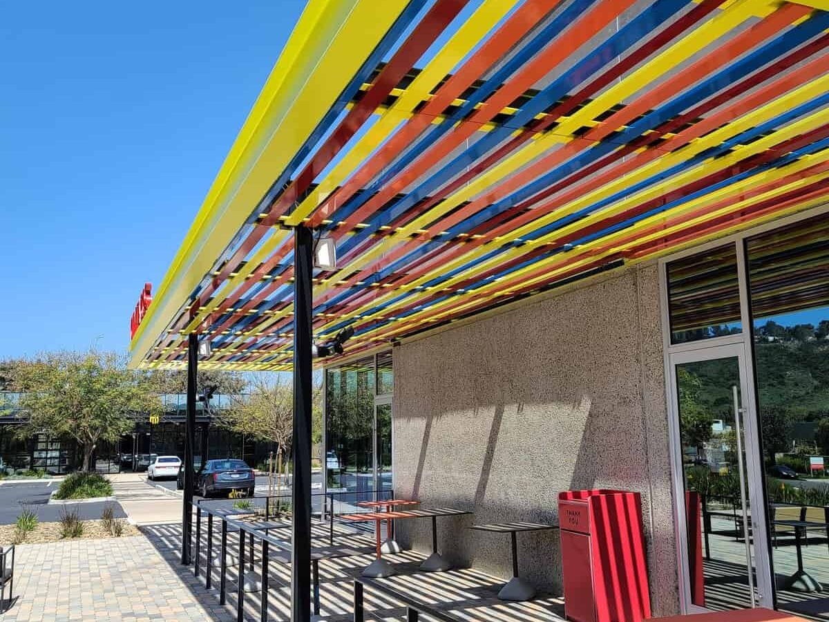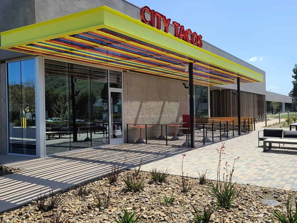 A fenced in patio area was created with a fun, multi-color canopy shade structure. The restaurant is serviced by a new grease trap, and brand-new stainless-steel food service equipment and counters were provided. High-end wood and other architectural finishes were applied to the interiors to enrich the customer experience.