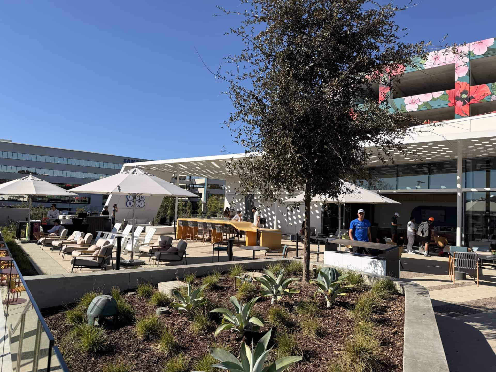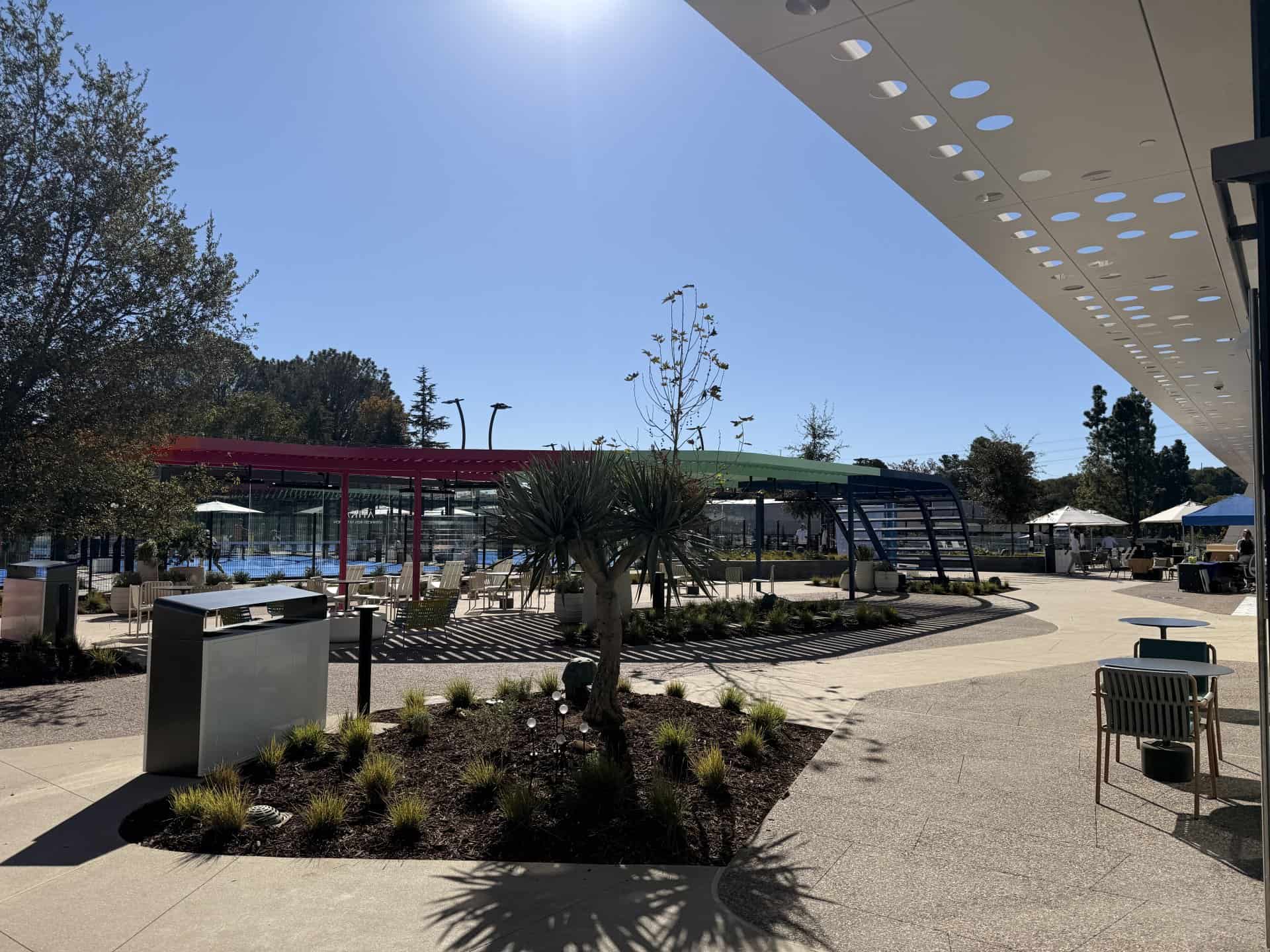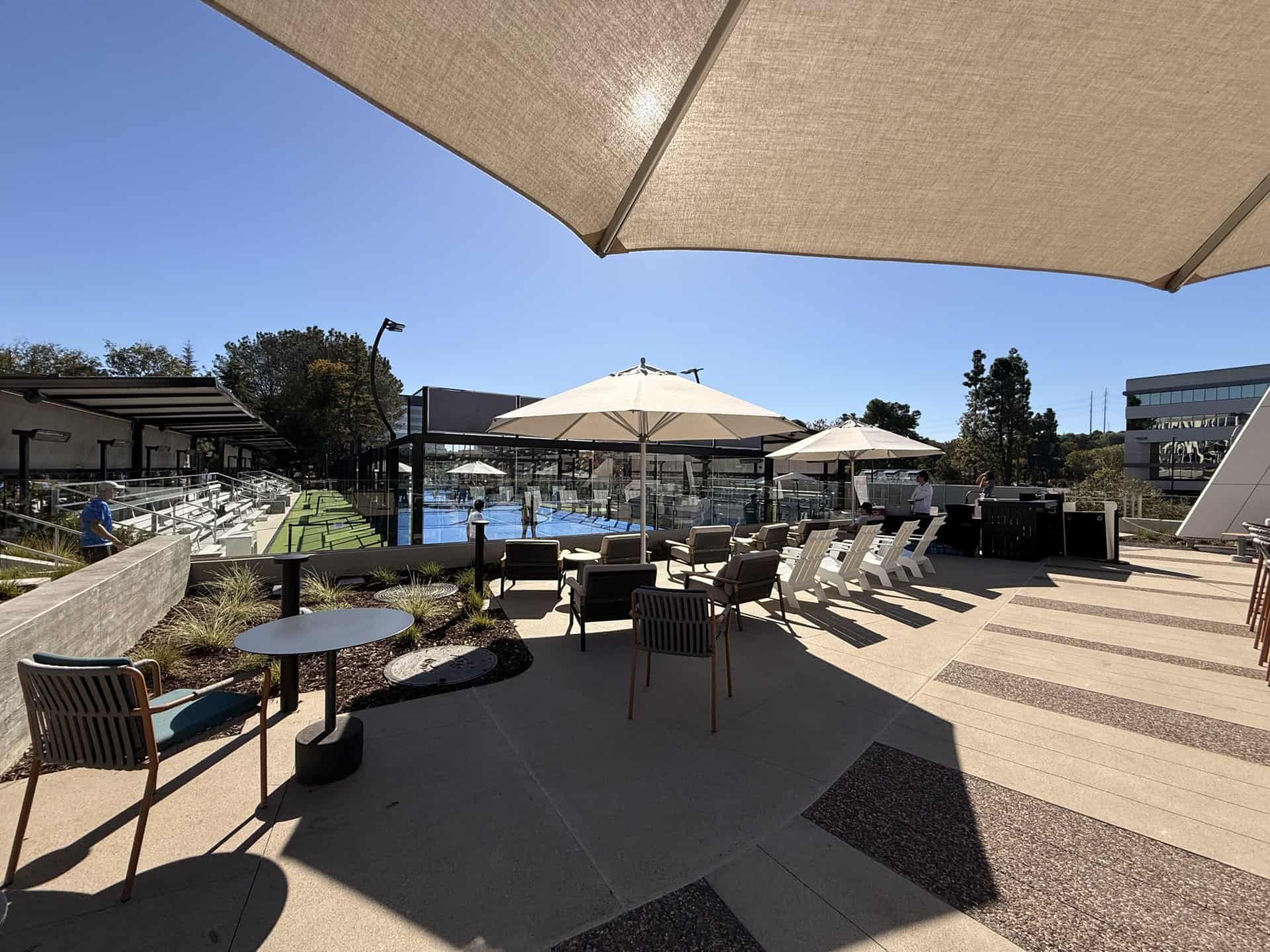 A central courtyard, highlighted by a signature dragon shade structure, serves as an inviting gathering space seamlessly connecting the clubhouse to the competition courts.